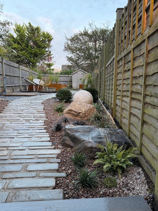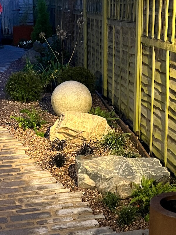 On the right hand side we installed some large pieces of our blue grey granite and by contrast a perfectly formed silver grey granite sphere. Our client is a keen gardener, so she intends planting the remaining beds herself.