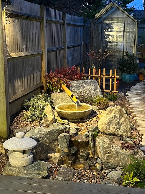 Using our new GYO style paving material, we laid a meandering path to create planting beds on the left and right. This style of paving is labour intensive, but it creates a stunning path way in an oriental garden setting. Close to the deck, so in full view of the house, we installed a traditional Japanese water basin arrangement that formed a short stream to an underground water reservoir. A Sumo san lantern was positioned on a flat top piece of rock.