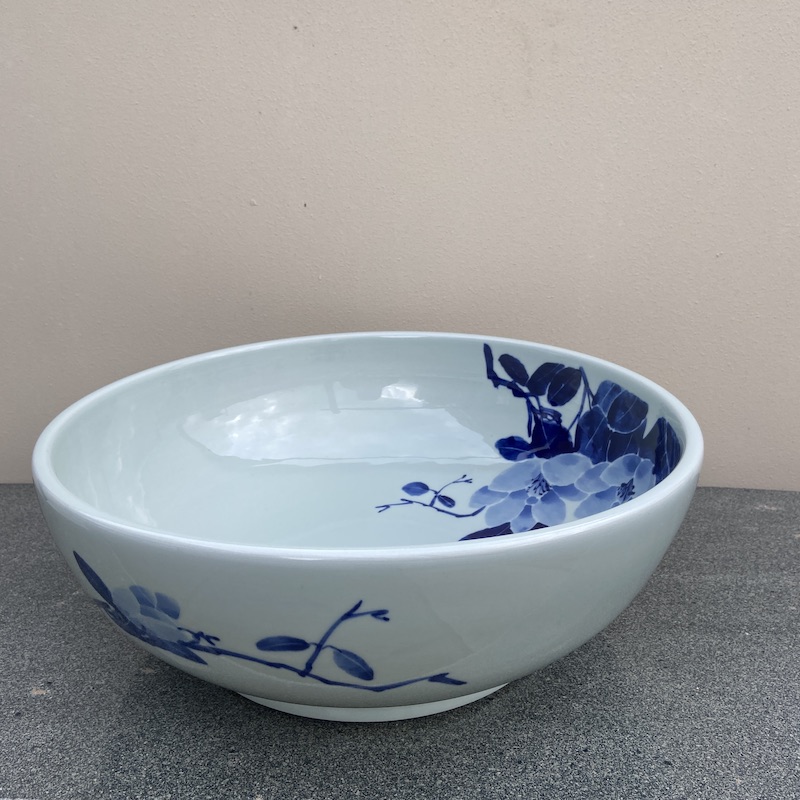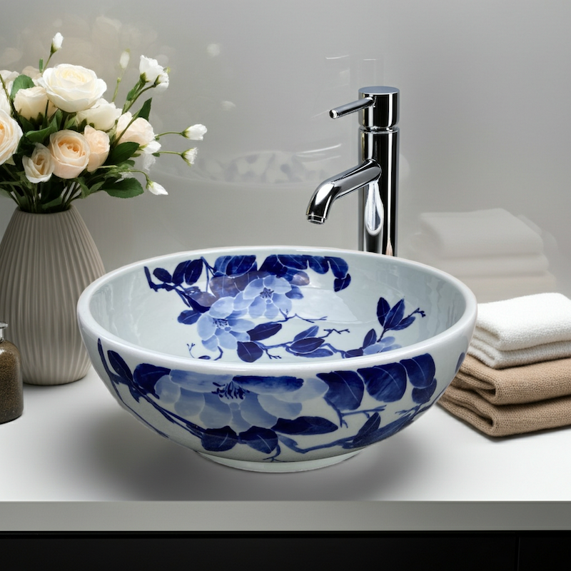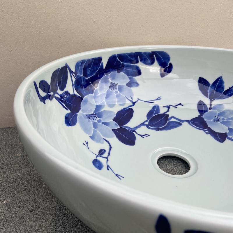 Inspired by traditional Japanese ceramics, this Cherry Blossom ceramic basin features a hand-applied cobalt blue cherry blossom motif on a soft white glaze. The flowing interior artwork follows the curve of the bowl, turning a functional fixture into a refined visual feature.