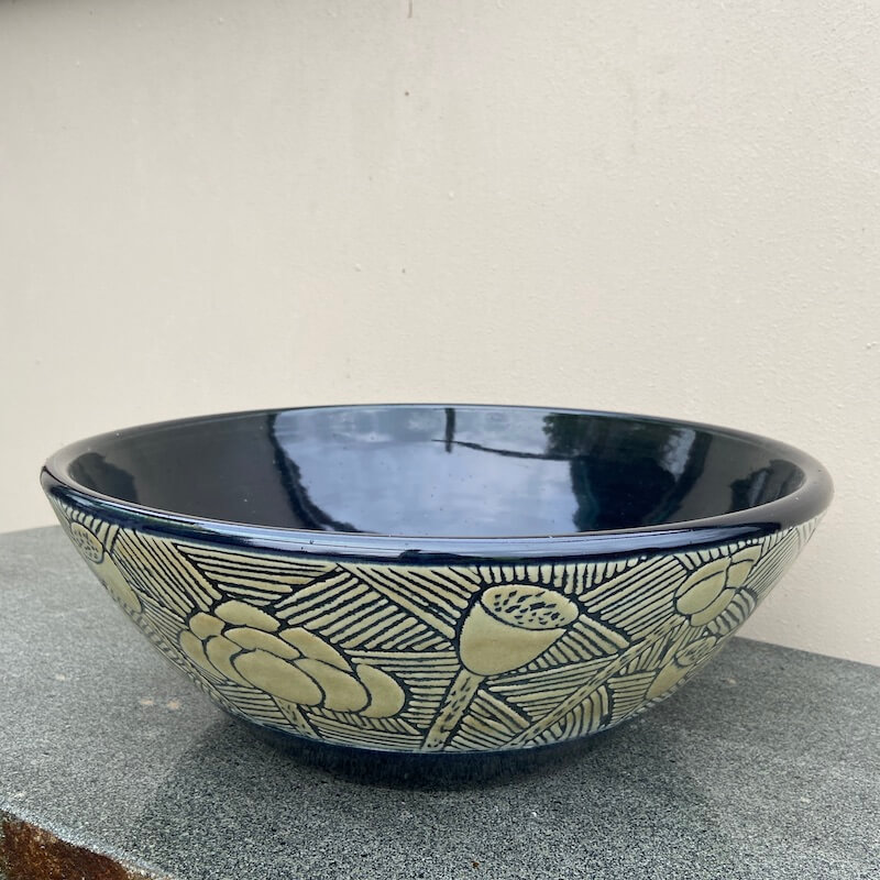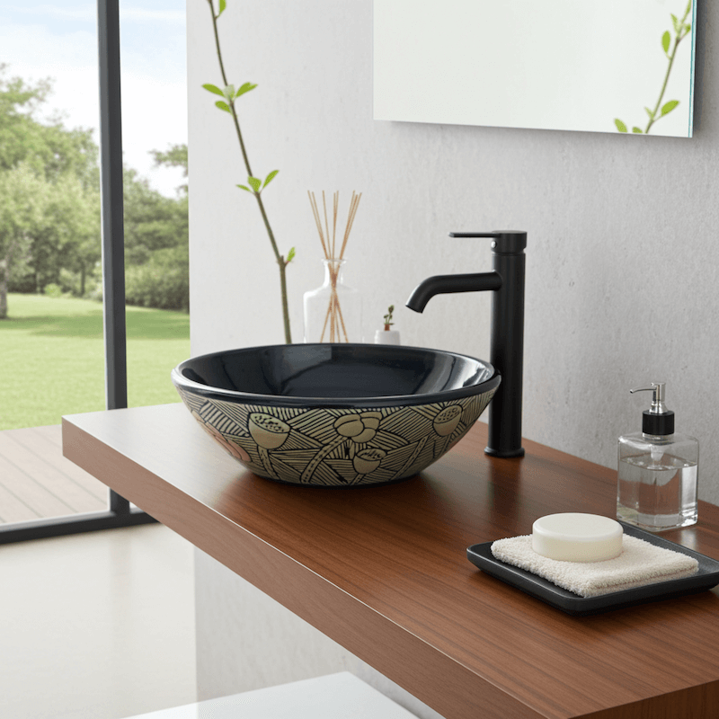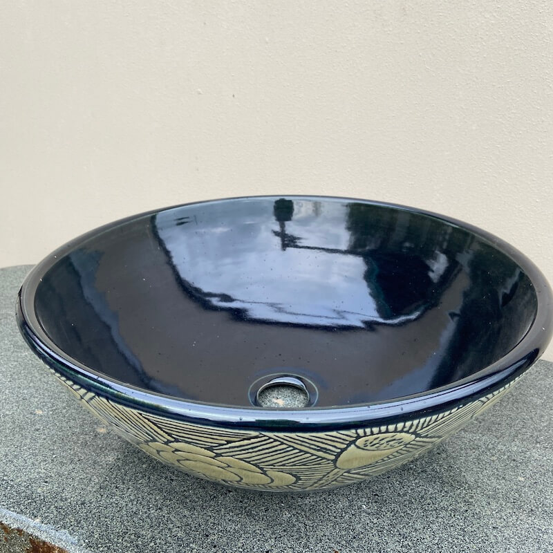 This Poppy ceramic hand basin features a deep black glaze paired with a hand-etched botanical motif that wraps around the outer form. The contrasting lines and floral detailing create a striking interplay between texture and gloss, echoing traditional Japanese decorative techniques while maintaining a contemporary presence.