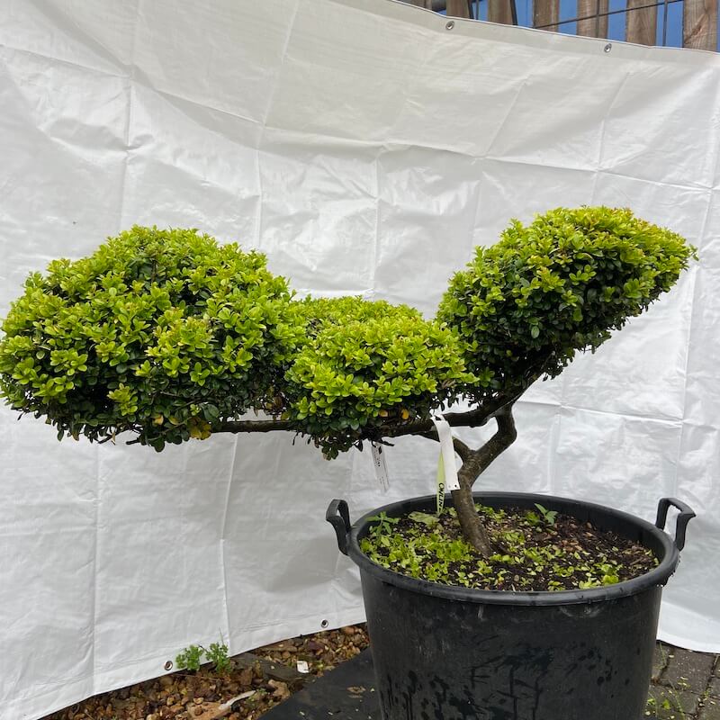 The variety ‘golden gem’ bear small black berries and styled trees such as these are very popular in Japanese Gardens.