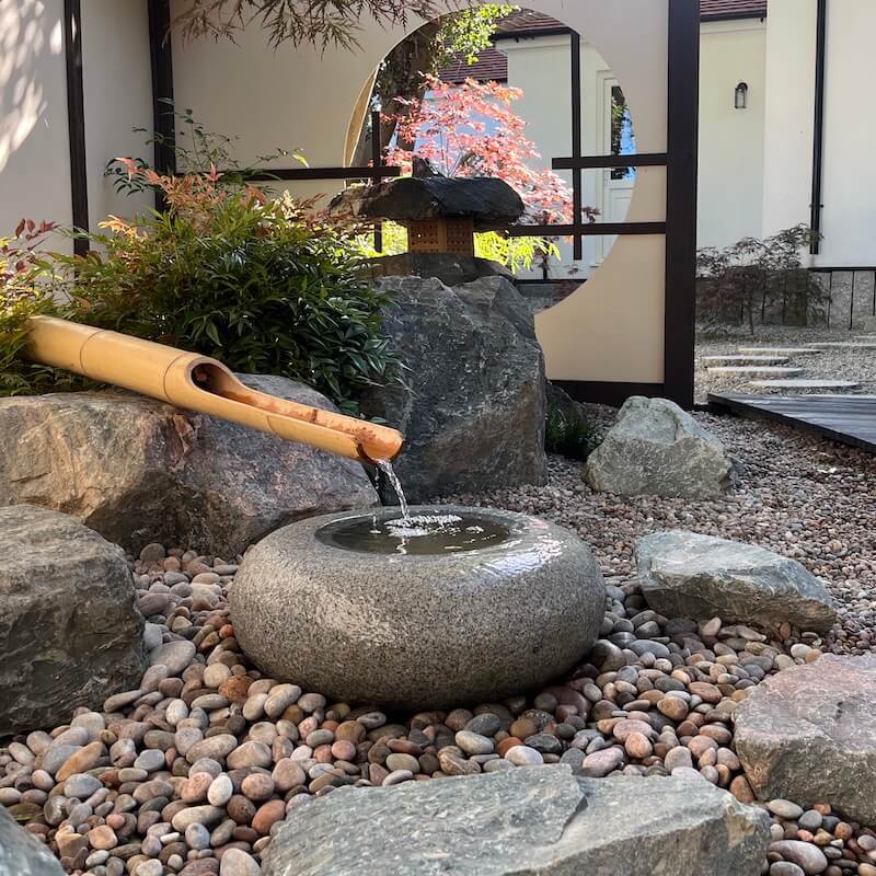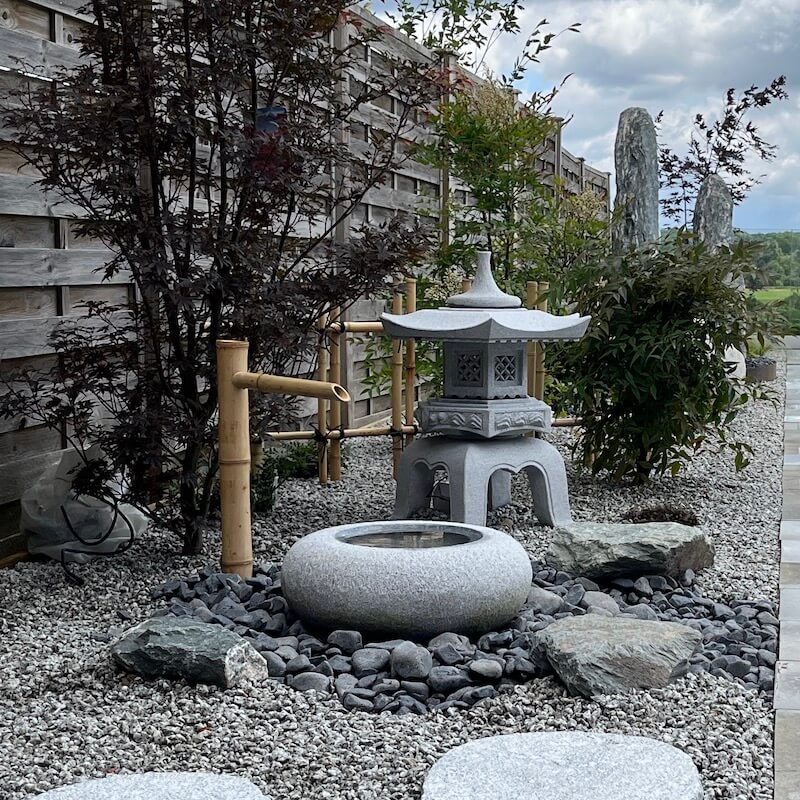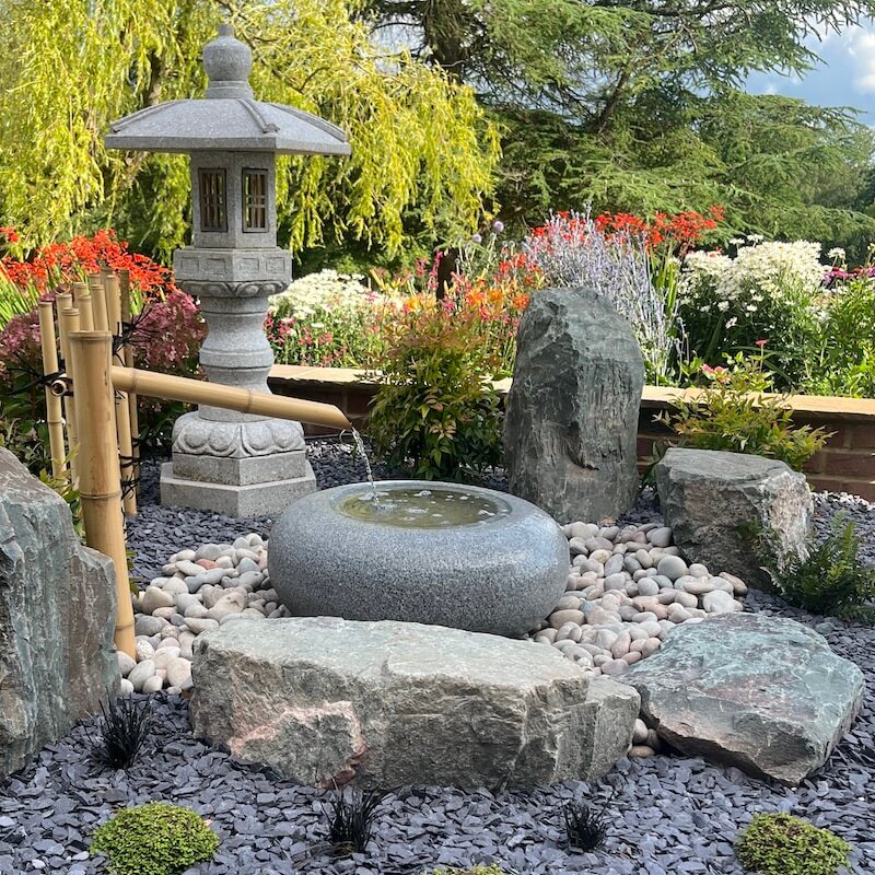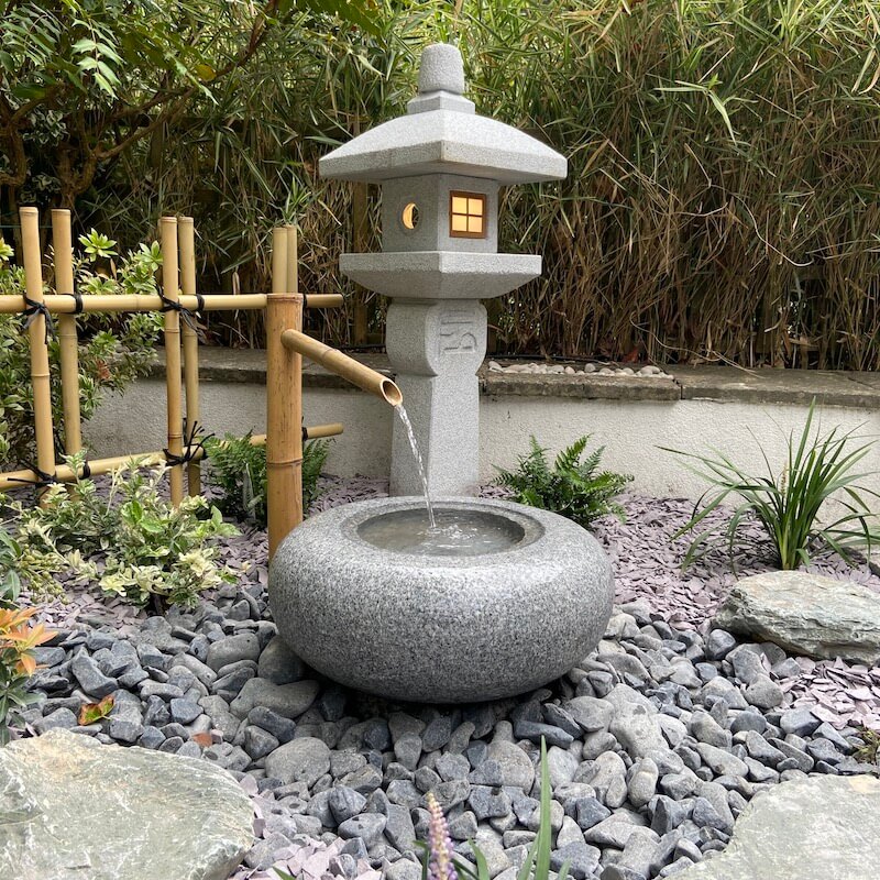 The Tetsu Bachi Japanese water basin is very popular with all our customers. Hand carved in natural silver grey granite, this stone bowl is ideal for an oriental water feature. Typically, you would expect to see a Tetsu Bachi nestled into a bed of water worn cobble stones and accompanied by Kneeling stones to form the traditional arrangement. Water gently trickles from a 50 cm Upright bamboo water spout and to complete the look use a decorative bamboo water Ladle & rest across the basin. An Oribe lantern is the one most often seen with this basin, although any of the stone lanterns from our range will work well with this granite basin.